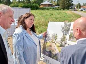 A képen (középen) Kathrin Gaál, bécsi alpolgármester és lakhatásért felelős városi tanácsnok látható a szén-dioxid mentes társasház átadóján.