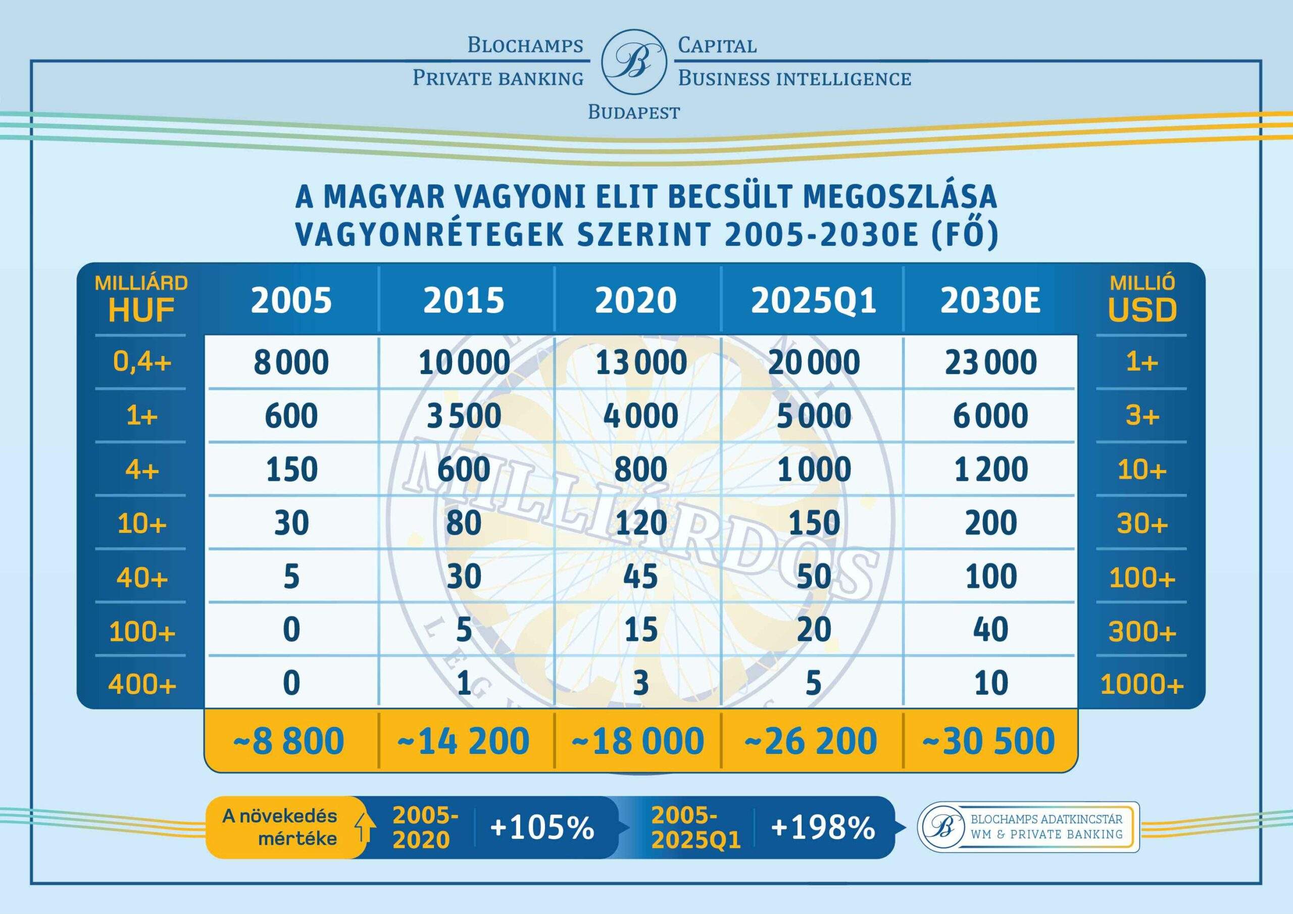 A Blochamps Capital szakembere arra figyelmeztet, hogy a hazai vagyonosodás üteme nemzetközi összevetésben is kiemelkedő. Miközben a világ milliárdosainak összvagyona az elmúlt tíz évben átlagosan 2,3-szorosára nőtt, a magyar elit legvagyonosabb szereplői nagyságrendekkel gyorsabb növekedést produkáltak. A folyamat tíz éve lankadatlan dinamikát mutat, a legfelső vagyondecilis 420.000 háztartása például a 2014-es hazai GDP 35.000 milliárdos összegéhez közeli 41.000 milliárdos nettó vagyonnal bírt, mára a 82.000 milliárdos GDP-t jelentősen meghaladó nettó 127.000 milliárdos vagyoni erőt tud magáénak.