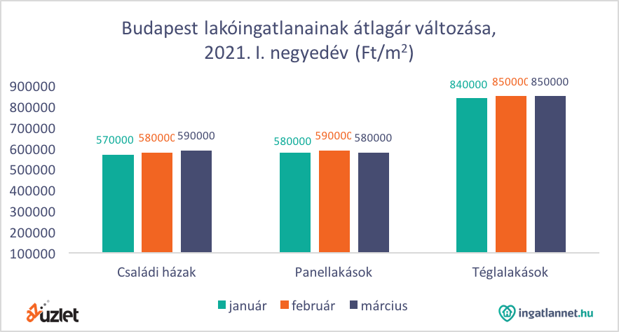 Ami a budapesti lakóingatlanok eddigi évben mutatott árváltozását illeti, bejöttek a szakértők számításai. A fővárosi piacon 2021 januárjában, februárjában és márciusában ugyanis nem sokat mozgolódtak az átlagos négyzetméter árak. A családi házak esetében mindössze 10 ezer Ft/m2-es volt a havi áremelkedés. Ha a panellakások átlagárát nézzük, akkor márciusban ugyanazt látjuk, mint januárban. A téglalakásoknál pedig szintén nem ment végbe látványos változás, a januári átlagáruk 10 ezer Ft/m2-rel lett drágább februárra, mely márciusban is megmaradt.