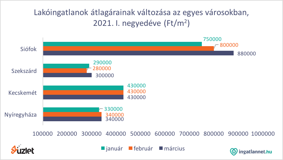 A fővárosban, Nyíregyházán, Kecskeméten, valamint Szekszárdon tehát beigazolódtak a jóslatok, nem úgy mint Siófokon. A népszerű üdülőhelyen ugyanis továbbra is a dráguló tendencia van érvényben. Januárról februárra 50 ezer Ft/m2-rel kerültek többe az eladásra kínált lakóingatlanok, márciusban pedig még további 80 ezer Ft/m2-rel lett magasabb az átlagáruk.