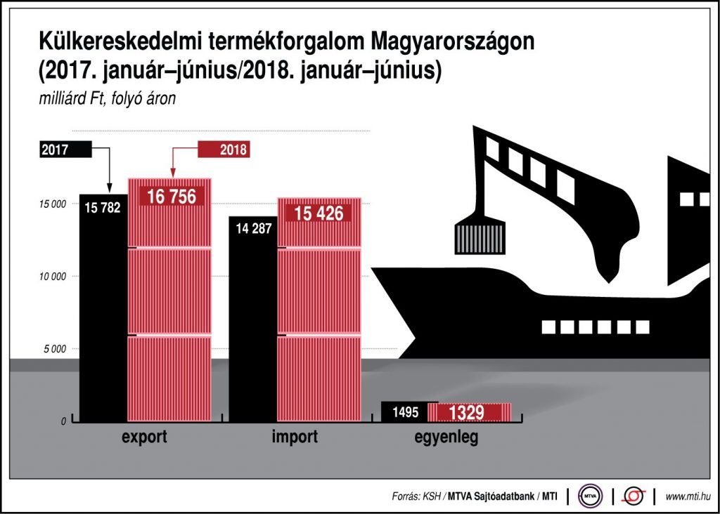 Az év első hét hónapjában a kivitel 5,7 százalékkal, a behozatal 6,8 százalékkal nőtt a tavalyi év azonos időszakához képest. A 4,593 milliárd euró exporttöbblet 307 millió euróval kevesebb a tavaly január-júliusinál. A kivitel héthavi értéke 61,813 milliárd, az import 57,220 milliárd eurót tett ki, adta hírül az MTI.
