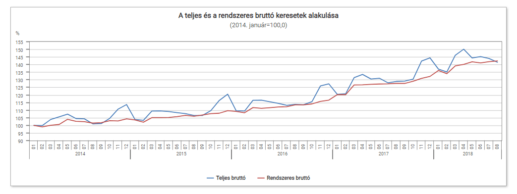 A növekedésre a munkaerő-kereslet élénkülése, a minimálbér és a garantált bérminimum 8, illetve 12 százalékos emelése, a költségvetési szféra egyes területeit, továbbá bizonyos állami közszolgáltató cégek dolgozóit érintő keresetrendezések voltak hatással – fűzte hozzá a jelentés.