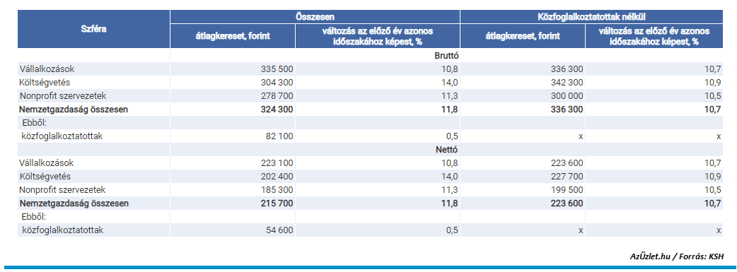 A közfoglalkoztatottak nélkül számolva az átlagos bruttó kereset 331 410 forint volt az év nyolcadik hónapjában.