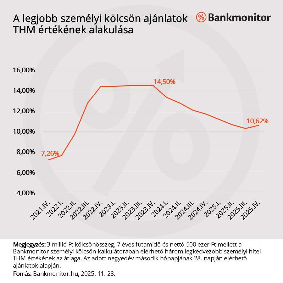 2021.végén a Bankmonitor személyi hitel kalkulátorában szereplő 3 legkedvezőbb ajánlat átlagos THM értéke 7,26% volt.