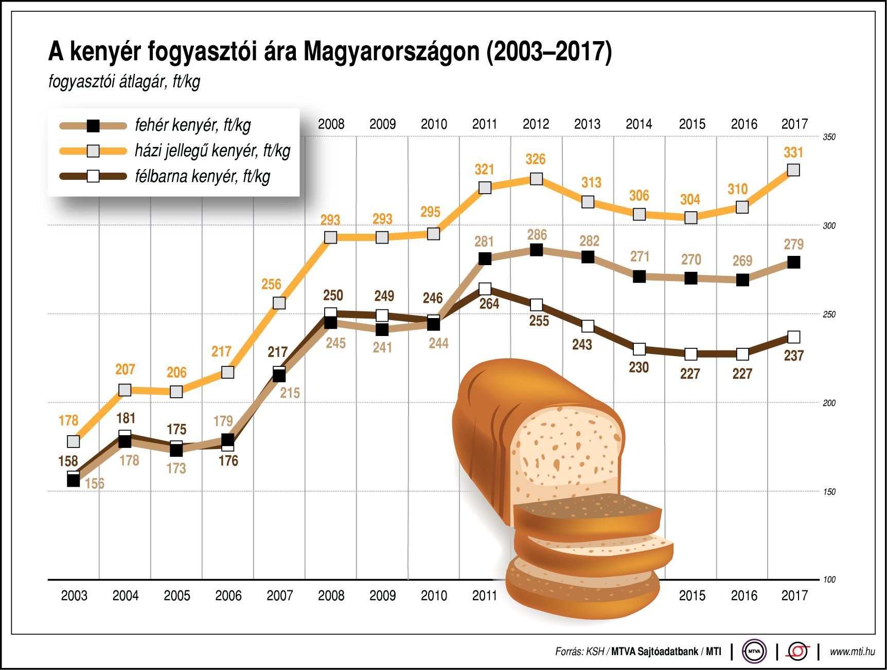 A kutatás szerint a fehér kenyér teljes önköltsége 181,11 forint, míg a pékárut előállítók átlagosan 175,08 forintért tudták értékesíteni azt, a félbarna kenyérnél ezek az értékek 184 forint és 160,51 forint, míg a vizes zsömlénél kilogrammonként 251,95 és 251,32 forint. A kutatáshoz az alapadatokat sütőipari vállalkozásoktól gyűjtötte be az intézet.