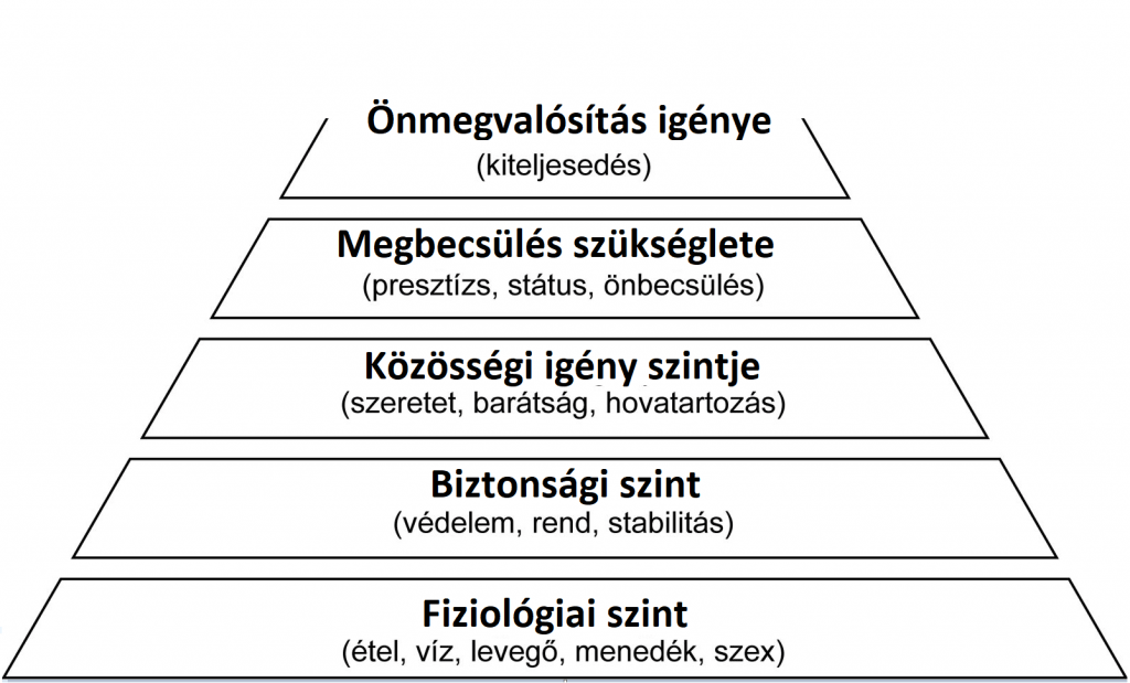 Maslow szerint szükségleteinknek öt szintje van. Az első a fiziológiai szint, ahová az étel, az ital, a levegő és a szex tarozik. Ha ezek a szükségletek kielégítést nyertek, következhet a második szint, a biztonság szintje, ahová többek között a lakás, a létbiztonság és a biztonságos környezet tartozik. Innen továbblépve eljuthatunk a szeretet, a társadalmi megbecsülés, a valahová tartozás szintjére, amely sok egyéb mellett magába foglalja a családot, a munkahelyet, az egyházat és más közösségeket. A negyedik, úgynevezett magasabb rendű színt az önbecsülésé, amely például a valóra vált célkitűzéseinket, elért eredményinket, stb. tartalmazza. A szükségleti piramis csúcsán az önmegvalósítási szint van, amelyhez akkor érünk el, ha azzá lettünk, amit elterveztünk (például híres művész, vezérigazgató, megbecsült tanár).