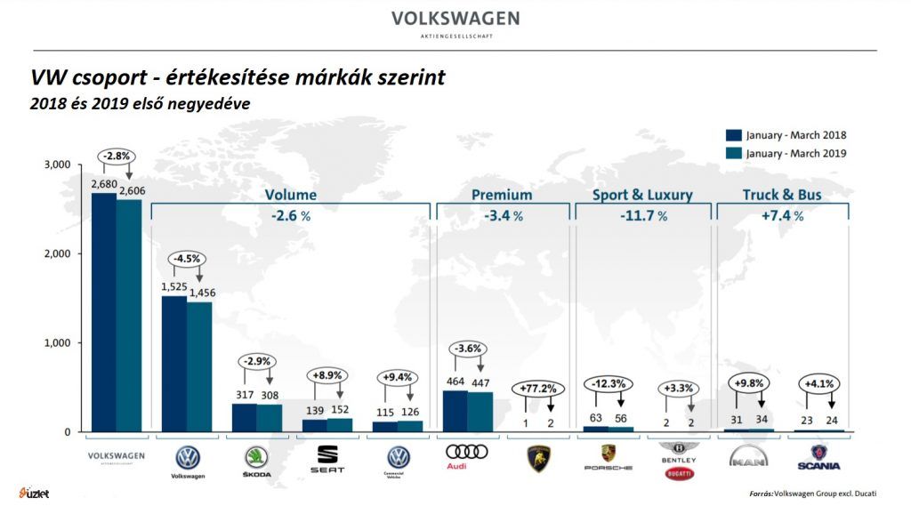 Az idei első negyedévben 2,606 millió járművet értékesített a Volkswagen konszern, 2,8 százalékkal kevesebbet az egy évvel korábbi 2,680 milliónál. A csökkenés elsősorban a legnagyobb piacon, Kínában elszenvedett visszaesésre vezethető vissza.