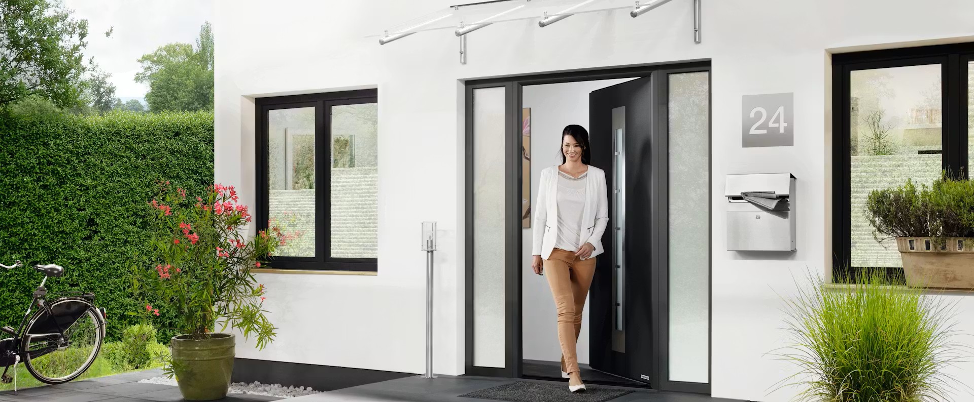 A Hörmann a 10 Color, a 10 MatchColor és a 7 Matt deluxe szín, valamint a 5 Decograin dekor közül kínál választási lehetőséget. Az új, keskeny üvegezéssel ellátott elegáns megoldások pedig még több természetes fényt engednek be, miközben megőrzik a kiemelkedő hőszigetelést. A Thermo65 ajtók opcionálisan RAL 9016 fehér belső oldallal is kaphatók, így tökéletesen harmonizálnak a fehér beltéri ajtókkal.